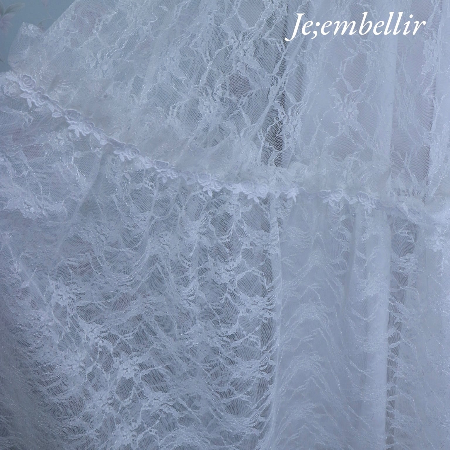繊細なレースを贅沢に使用したデザインは、まるでおとぎの国から抜け出したような雰囲気を醸し出します。裾にはフリルが施され、エレガントなシルエットを演出します。